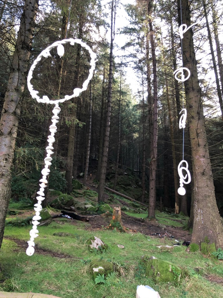 I collected pine cones from these very trees earlier in the year and i coated them in porcelain slip, high fired them and interwove them into some of the ceramic sculptures as I wanted to have part of the trees physically incorporated into the sculptures to aid their earthing to that spot. Porcelain clay is itself of the earth and its a fitting material to use when creating sculptural pieces to sit in a natural environment.