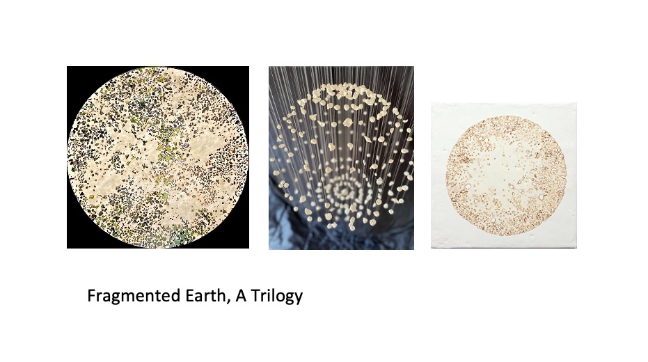 This Metamorphosis of our world where there are holes, there are small solid pieces hanging, by a thread, there is fragility in its solidity. Our Trilogy. Fragmented Earth, A Trilogy was a slow process in the making, started before Covid was unleashed on our world and now showing just as Covid is coming to an end. We both very much enjoyed its creation.