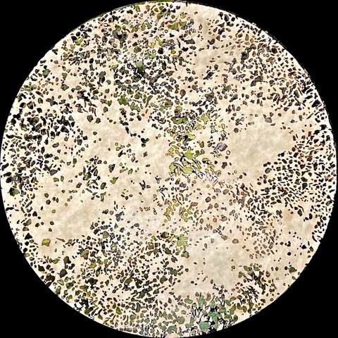 2. Porcelain ceramic hanging sculpture 50cms x 80cms, Acrylic disc with 133 lines of individual porcelain pieces. Andrea Kavanagh