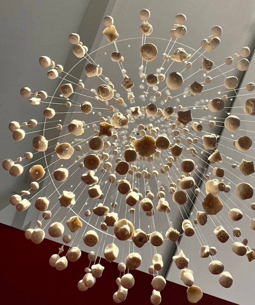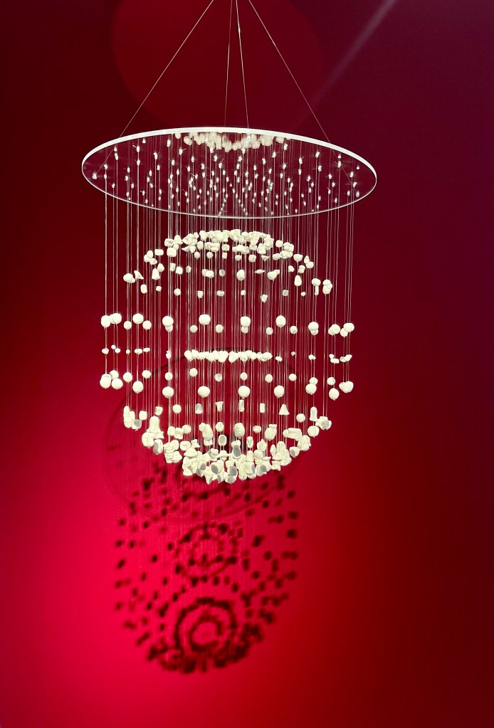 “Natural Rotation” hangs and gently rotates in the air, it’s shadow is integral to its form. Porcelain ceramic sculpture with acrylic disc 42cm diameter x 75cm.