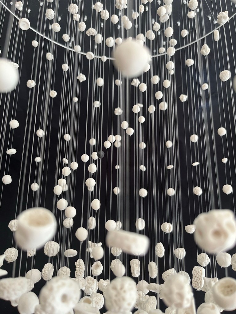 This year I will be exhibiting a new piece of work titled “ Universe Within” “42cm circumference x 75cm approx height. Porcelain ceramic Sculpture, with 326 individually made pieces hanging together forming a delicate exploded sphere.