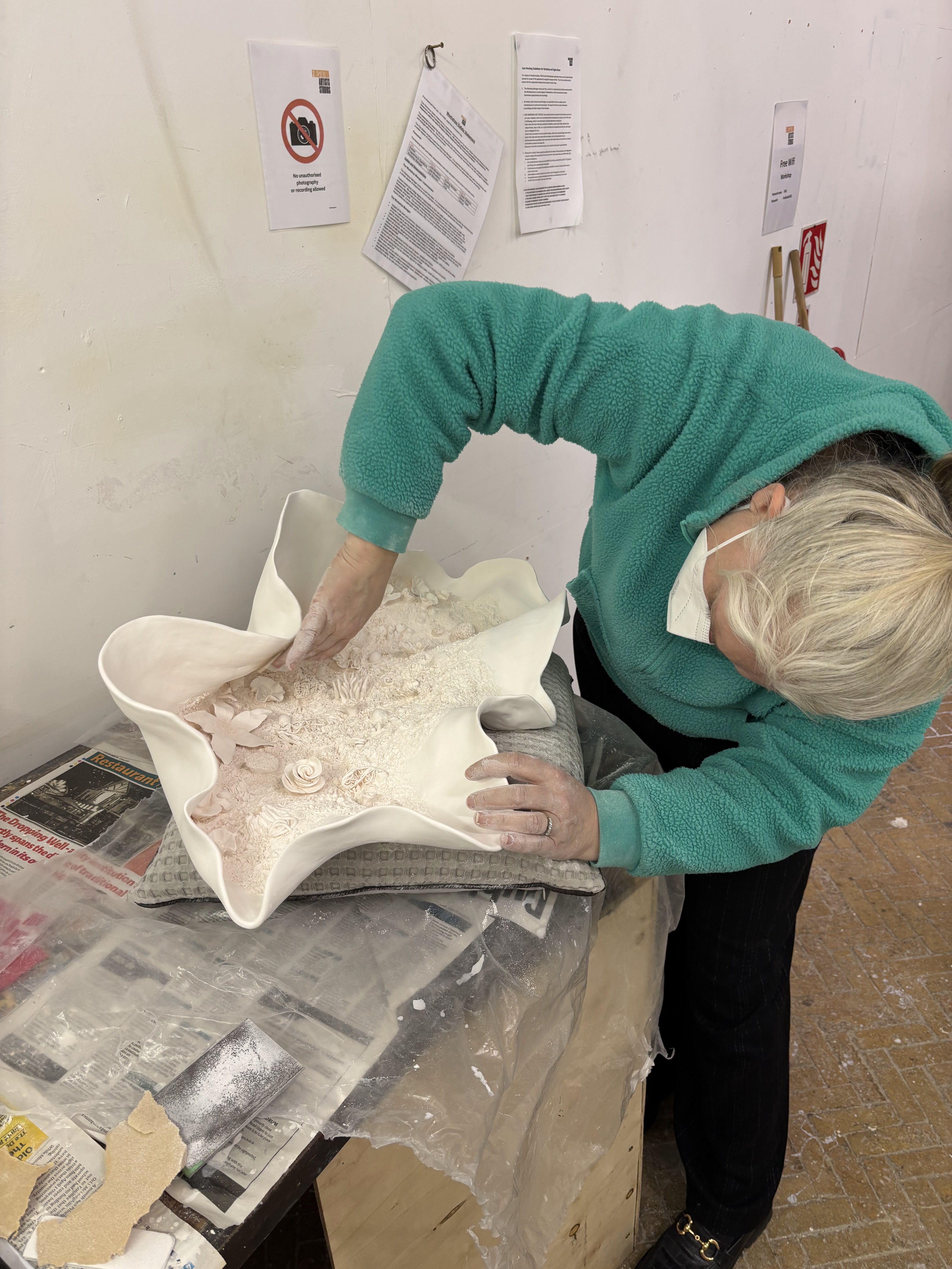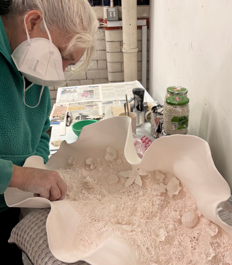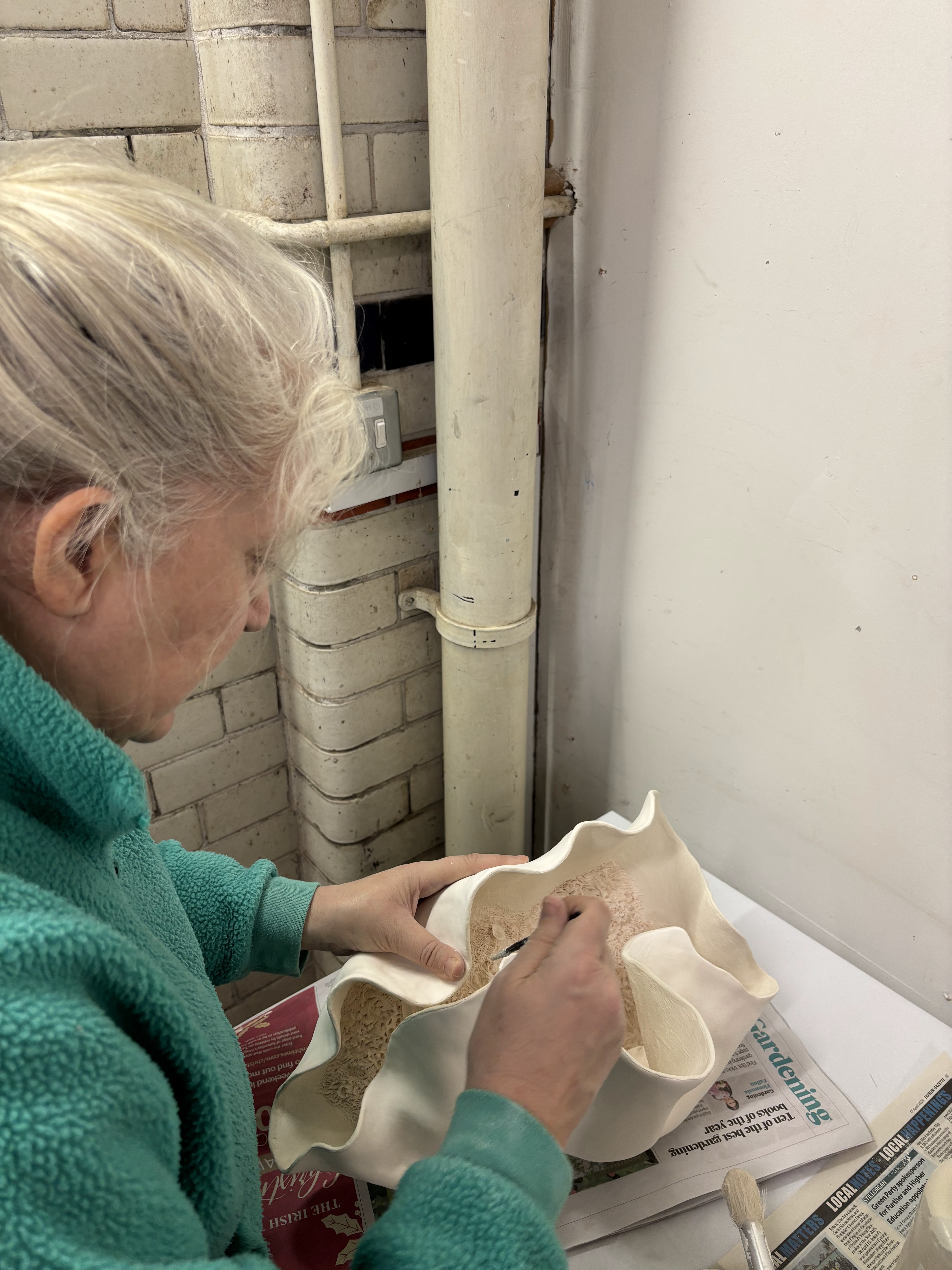A few images here of me working in The Fire Station studios. One is of me applying transparent glazing to the edge of a bisque fired work which is a larger and more convoluted organic shape for me. On the high fire this form will most likely close over more, which is what im aiming for here.