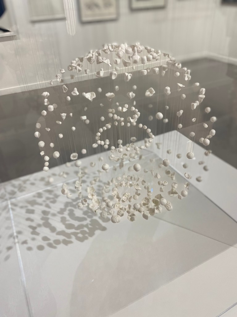 Luminous Seeds 2024 , 194th RHA Open exhibition. Porcelain, acrylic, line, beads, gold lustre glazing, mirror.